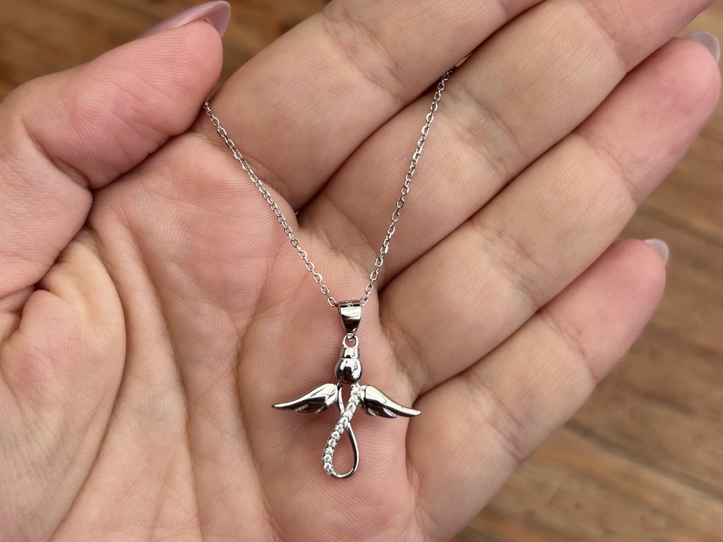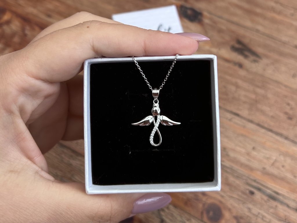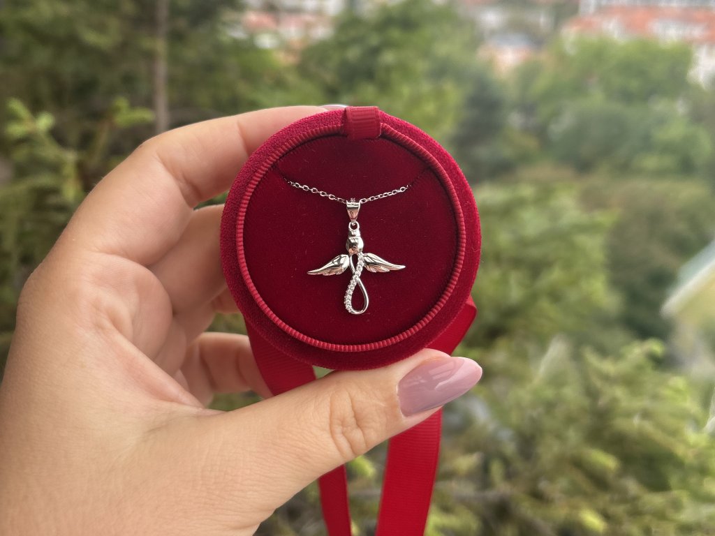 Design: Jemný přívěsek anděla s minimalistickým tvarem křídel, zdobený třpytivou linií zirkonů. Symbolizuje ochranu, naději a světlo.