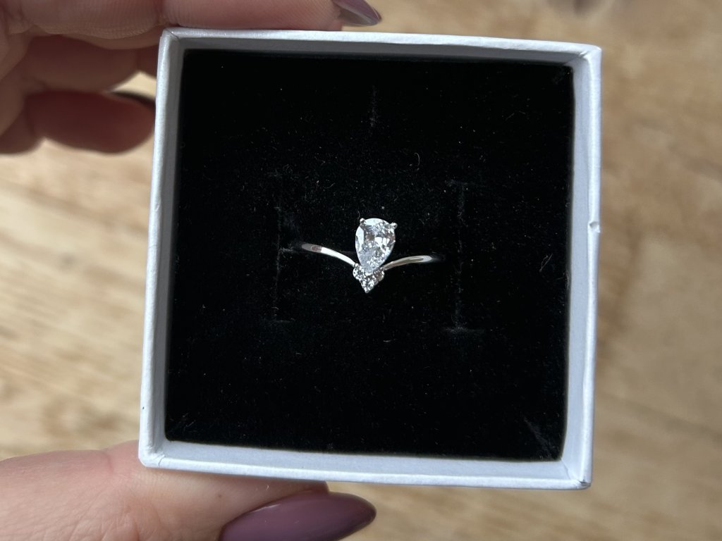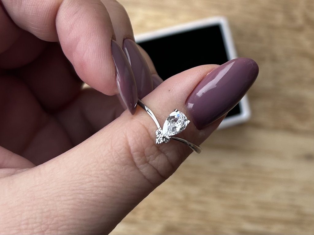 - Design: Krásný stříbrný prsten s netradičním, ale elegantním tvarem zdobeným dvěma zirkony – jedním větším broušeným do tvaru kapky a druhým menším ve tvaru srdce. Tento detailní design dodává šperku romantický nádech a moderní sofistikovanost.