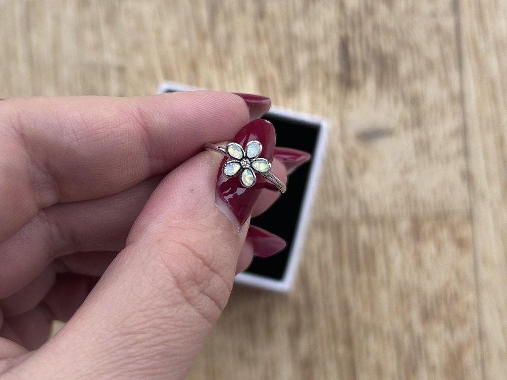 • Design: Prsten zaujme roztomilým motivem květiny, která je tvořena pěti okvětními lístky ze syntetického opálu. Jeho jemný třpyt a pastelové odlesky dodávají šperku romantický a mladistvý vzhled. Střed květu zdobí drobný čirý kamínek pro ještě větší lesk.