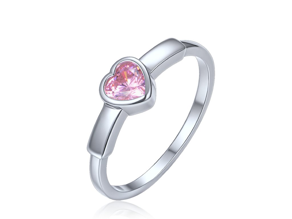 Design: Minimalistický prsten s centrálním motivem srdce, ve kterém je zasazen růžový zirkon. Čisté linie podtrhují jemný a romantický styl.