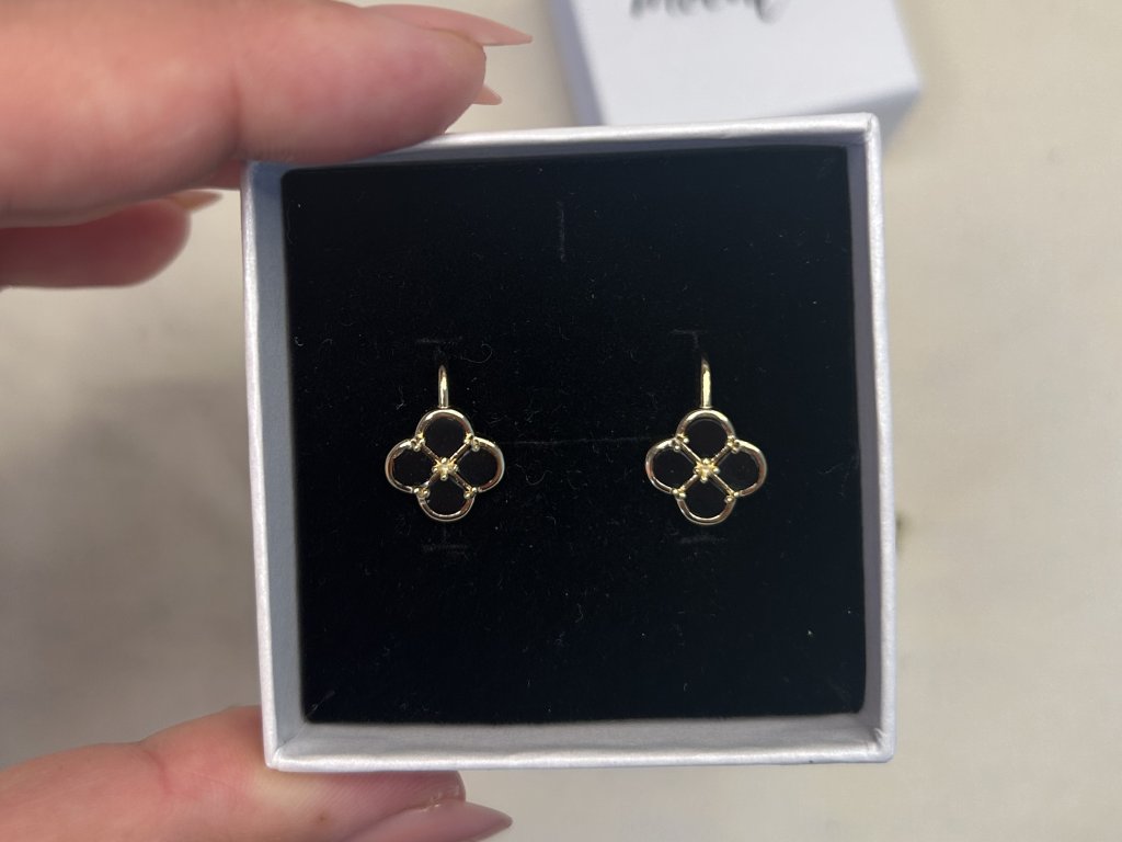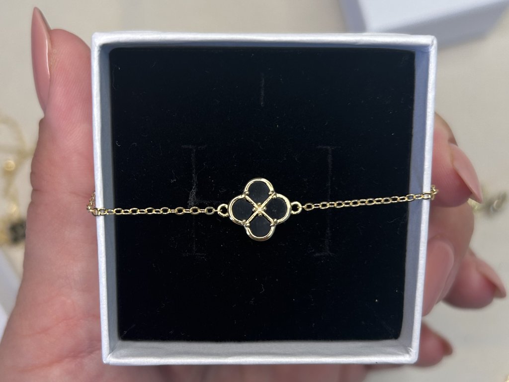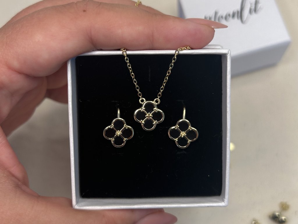 Design: Čistý a stylově jednotný design založený na oblíbeném motivu čtyřlístku, který symbolizuje štěstí a rovnováhu. Každý šperk je zdobený černě barvenou přírodní perletí, která v kombinaci se zlatem vytváří elegantní a nadčasový vzhled. Jemné detaily, precizní zpracování a pohodlné zapínání dělají z tohoto setu perfektní doplněk pro ženu, která miluje sofistikovanou symboliku.